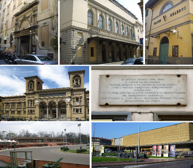Anche nel campo dello spettacolo avvennero notevoli mutamenti; crebbe il numero delle sale: mentre il Teatro della Pergola restava il teatro dell’élite cittadina (puntata n. 27, figura n. 79, nel capitolo dedicato alla dinastia medicea), l’antico Teatro del Cocomero prende il nome di Teatro Niccolini (figura 101, 1 dall’alto e da sinistra e così a proseguire); si creano poi nuovi spazi, con l’inaugurazione del Teatro delle Logge (che diventerà un cinema, per essere chiuso a sua volta) e del Teatro Principe Umberto (oggi non più esistente); senza dimenticare l’attuale Teatro Comunale (figura 101, 2) che tuttora ospita gli spettacoli del Maggio Musicale Fiorentino (prestigiosa manifestazione artistica). Numerosi poi i teatri primaverili ed estivi, tra i quali ricordiamo l’Arena Goldoni, che veniva utilizzata di giorno e aveva il suo corrispettivo “notturno” nel tutt’ora esistente Teatro Goldoni (figura 101, 3); e infine l’Arena Nazionale, destinata anch’essa a diventare un cinema, per poi essere chiusa. In questi teatri si rappresentava un po’ di tutto: dall’operetta alla tragedia, dagli spettacoli dei domatori a quelli degli illusionisti, dalle gare sportive di lotta greco-romana a quelle degli atleti impegnati agli attrezzi.
