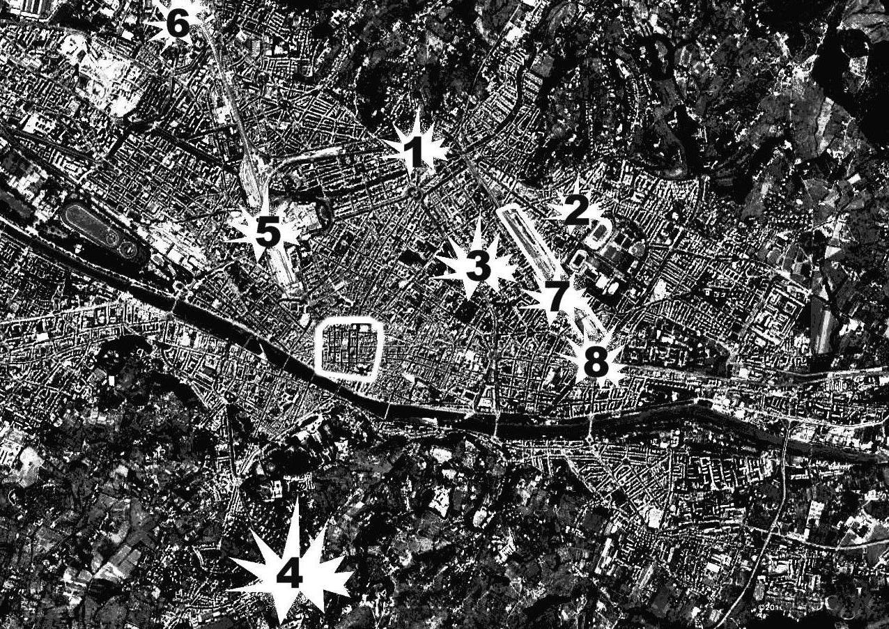 Mentre i feriti venivano portati in ospedali improvvisati, gli sfollati raggiungevano le case requisite del centro storico, contribuendo a quell’ammassarsi di popolo che avrebbe portato da lì a poco notevoli problemi sanitari. Il bombardamento, per di più fallito, provocò molta impressione nei Comandi alleati, cosicché si decise di risparmiare altre incursioni alla città per tutto il restante 1943; ma i tedeschi continuavano a utilizzare il nodo ferroviario di Campo di Marte, e così il Generale Britannico Harold Alexander fu costretto a nuove incursioni aeree su Firenze. L’incursione del 18 gennaio 1944 causò 10 vittime; la successiva dell’8 febbraio 1944 colpì, con morti e feriti, molte case sul Poggio Imperiale (figura 111, 4). Gli Alleati cercavano di colpire i paesi vicini, sperando così di far desistere i tedeschi dal servirsi dell’inviolabilità di Firenze per condurre le loro operazioni belliche, ma seguirono altri bombardamenti fino al marzo 1944, durante i quali furono danneggiate gravemente ville storiche e chiese, oltre che gli impianti ferroviari di Porta al Prato (figura 111, 5) di Rifredi (figura 111, 6) e di Campo di Marte (figura 111, 7) nonché Piazza Leon Battista Alberti e Via Lorenzo di Credi (entrambe in figura 111, 8).