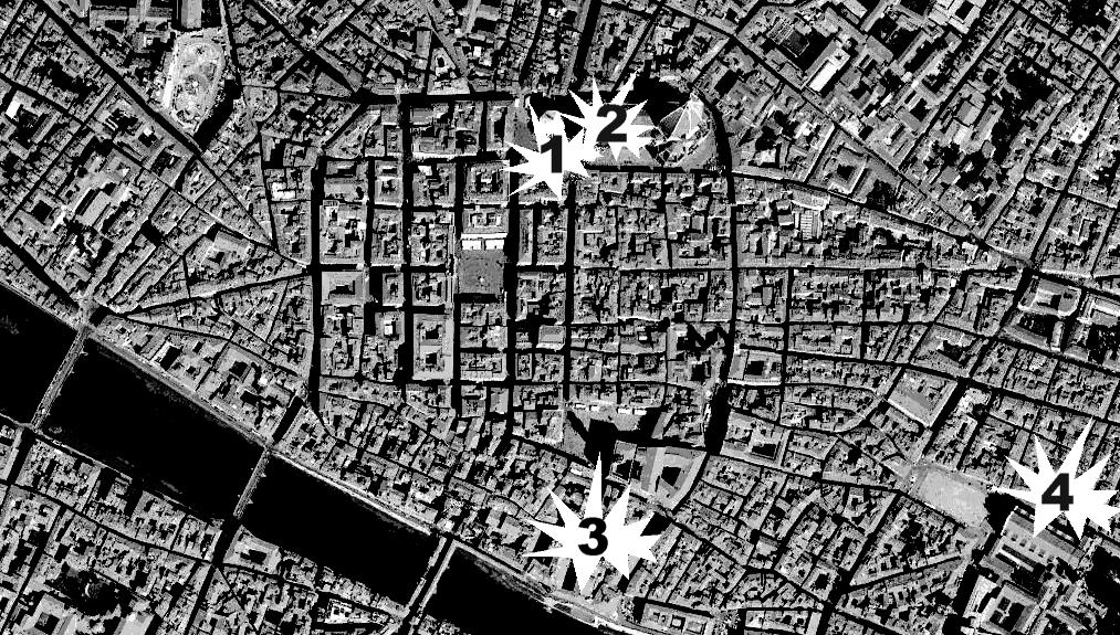 Centinaia di bombe ad alto potenziale distrussero edifici, capannoni e vetture ferroviarie: tutto ciò dimostrava che il principio di inviolabilità non esisteva più. Complessivamente Firenze subirà ben 325 allarmi, 25 attacchi e 7 bombardamenti pesanti. In nessuna di queste occasioni la contraerea riuscì mai ad abbattere un solo aereo nemico. I morti furono più di 700, ma è impossibile stabilire quanti perirono più tardi in seguito alle ferite. I danni alle cose non risparmiarono nemmeno i luoghi “sacri” del centro storico; in momenti diversi furono danneggiati, tra gli altri, la Loggia del Bigallo (figura 112, 1); il Campanile di Giotto (figura 112, 2); la Galleria degli Uffizi che, a seguito delle vibrazioni causate dalle esplosioni dei ponti che i tedeschi faranno saltare, subì danni per lo più indiretti e per fortuna non irreparabili (figura 112, 3) e l’area di Santa Croce (figura 112, 4).