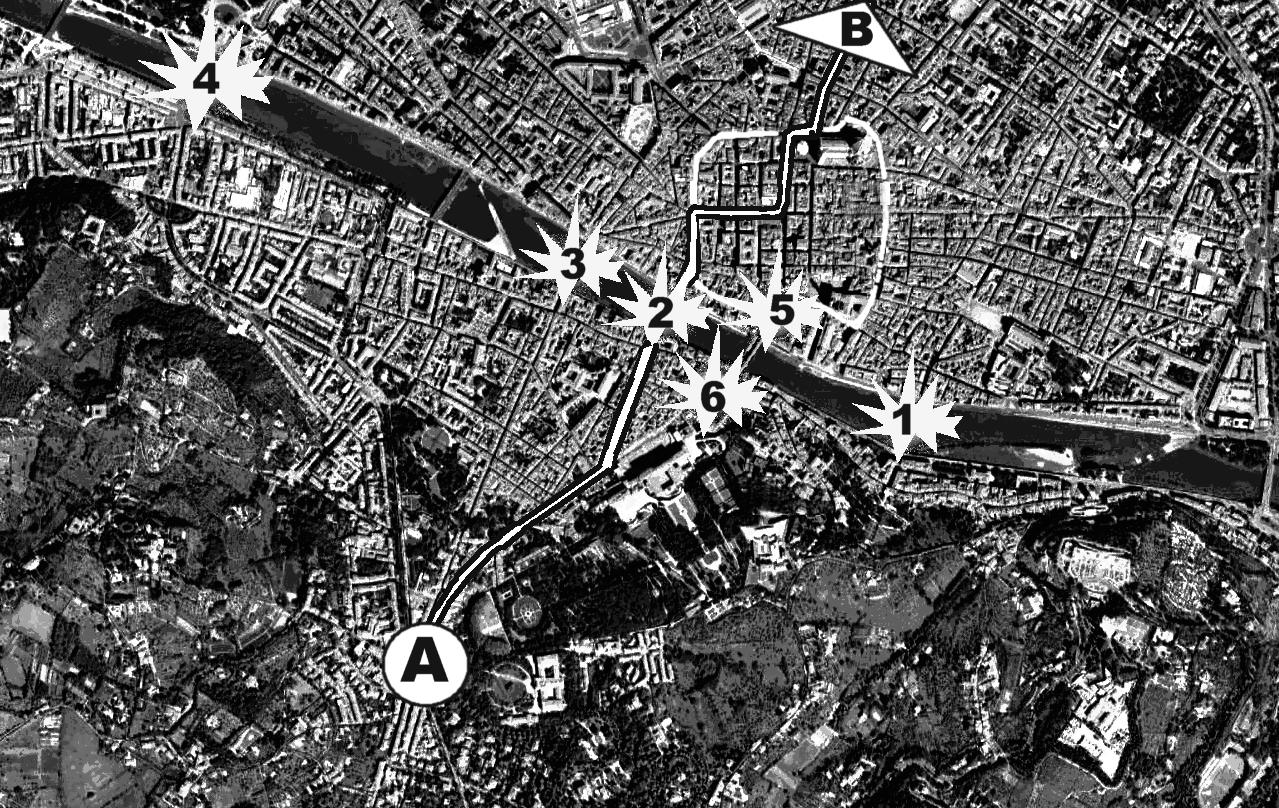 Gli uomini della Wehrmacht erano intenzionati a lasciare la città tramite un percorso che attraversava il centro di Firenze; era evidente che, finché si fossero trovati dentro l’area storica, non sarebbero stati colpiti da attacchi aerei. Sui muri delle case fiorentine erano state disegnate delle frecce che servivano ai tedeschi a indicare i tragitti possibili: fra questi, come abbiamo appena detto, vi era quello che i fuggitivi intesero privilegiare. Lo si può vedere in figura 113, da “A” verso “B”. Da Porta Romana, Via Maggio, Ponte Santa Trinita, Via Tornabuoni, Via degli Strozzi, Piazza della Repubblica, Via Roma, Piazza del Duomo, Via Martelli fino a Via Cavour, oltre alla quale vi era la strada di fuga verso nord.