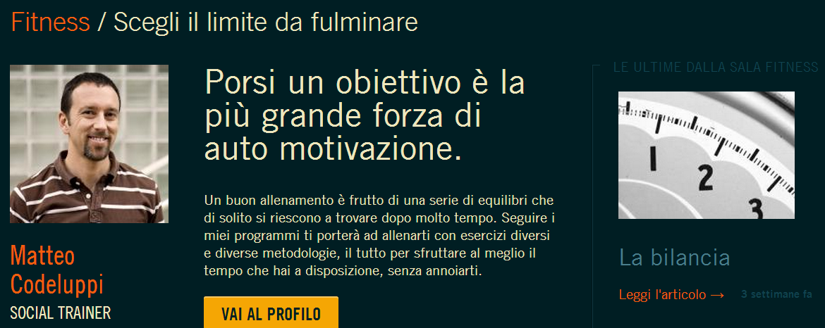 Accedendo a www.fulminaituoilimiti.it, si può scegliere il proprio sport tra i cinque a disposizione, tra i più praticati: calcetto, tennis, corsa, fitness, ciclismo. Selezionando il preferito, va indicato poi il proprio livello di competizione, cui corrisponde un obiettivo di performance. I livelli sono tre, e corrispondono alla preparazione fisica del momento e all’importanza della disciplina sportiva nella vita del praticante.