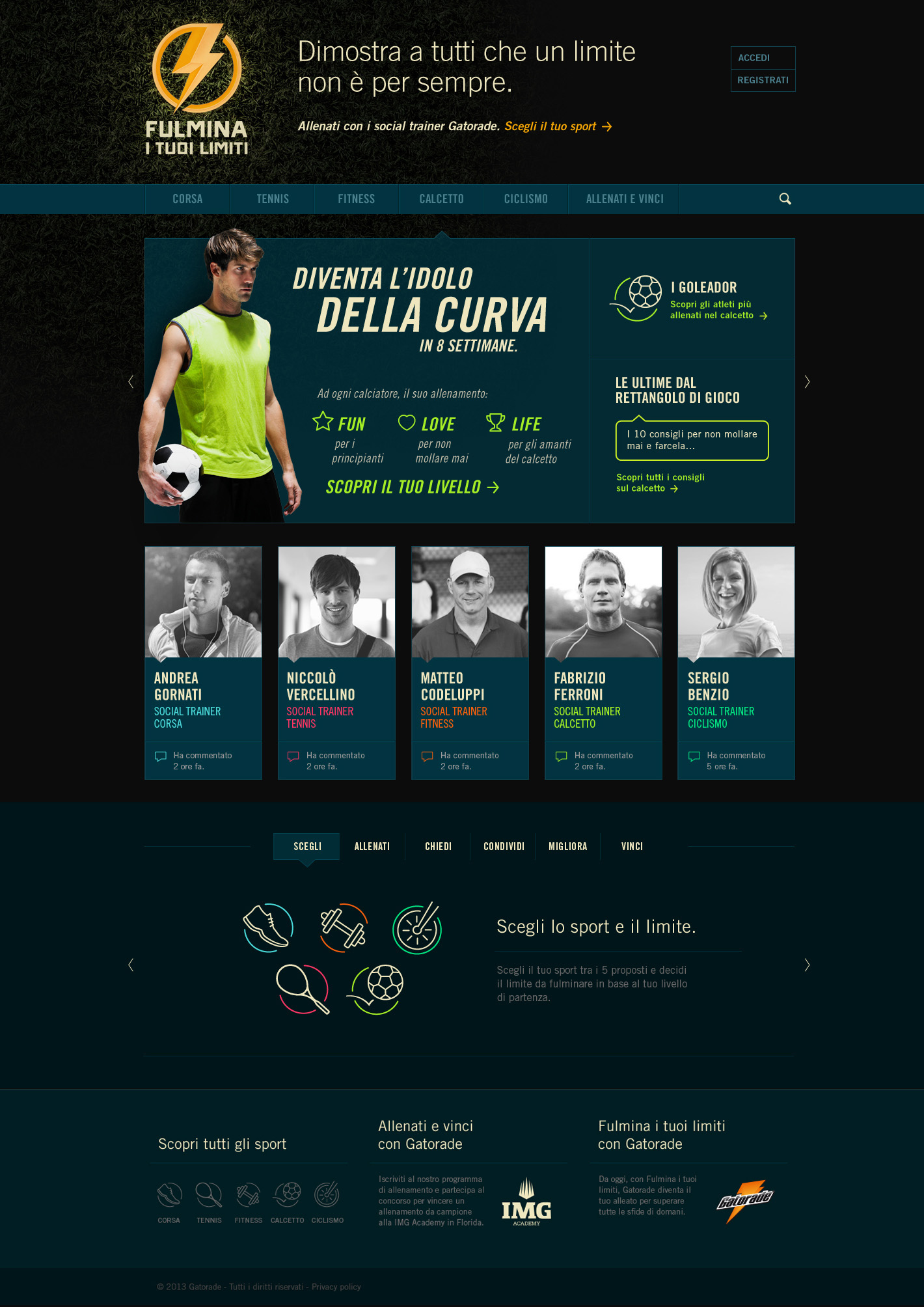 Gli sport interessati sono cinque, tra i più praticati: calcio, ciclismo, corsa, fitness, tennis. Per ciascuno di essi è prevista una homepage individuale, che a rotazione introdurrà gli utenti nel sito. Per ogni disciplina ci sarà un trainer specializzato, e tutti coloro che utilizzeranno la piattaforma parteciperanno al concorso “Allenati e vinci con Gatorade”, in palio 30 kit sport Adidas e un viaggio alla IMG Academy in Florida per un’esperienza sportiva a 360° al fianco dei migliori allenatori internazionali.