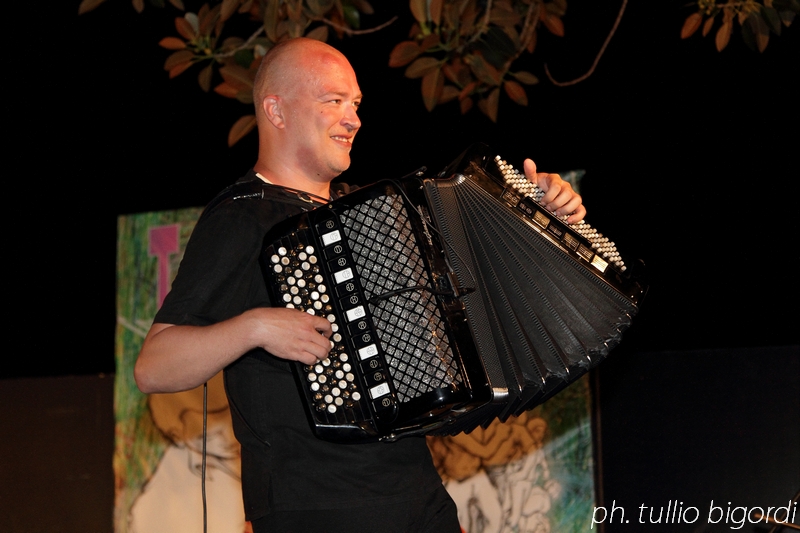 Presenza carismatica e grintosa, gli Tsuumi non rinunciano a evocare; e quando lo fanno (cioè quasi sempre) percorrono in equilibrio naturale tradizione etnica e suoni da terzo millennio; ecco perché ci appaiono in sincronia fiabeschi e progressivi, latini, anglosassoni e balcanici. Leggete i loro nomi, per noi difficilmente pronunciabili in questa Europa sempre ansiosa di mettere in comune una moneta, tanto quanto distratta nel diffondere la meraviglia delle sue mille culture: Hannu Kella (qui a destra, foto di Tullio Bigordi), fisarmonica; Esko Järvelä, violino e viola; Tommi Asplund, violino; Pilvi Järvelä, tastiere; Jussi Nikula, percussioni; Tarmo Anttila, contrabbasso; Joakim Berghäll, sassofono e percussioni; Jani Kivelä, chitarra, cetra. La musica é composta da Hannu Kella, maestro fisarmonicista. Pilvi Talvities è l’unica figura femminile: una grande musicista.