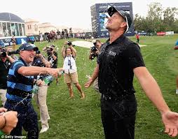 Eccezionale Stenson, esempio vivente in campo sportivo di come sia possibile risalire nella vita, che cela insidie una dopo l’altra, ma anche gioie immense. Come quella di Henrik, che festeggia a suon di champagne (a destra, foto daylymail.co-uk) con moglie, bambini e amici l’ennesima vittoria di carattere.
