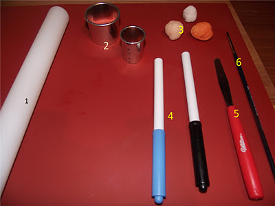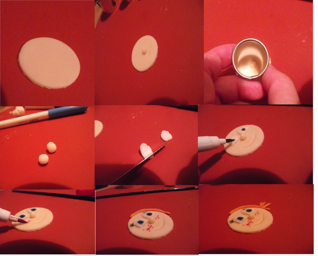 Stendete la pasta color carne e fate un cerchietto col n.4, con un pennellino bagnato di acqua bagnate il punto dove aggiungerete il naso e con il cerchietto n.1 (anche un tappo di bottiglia va bene) fate una leggera pressione per fare la bocca.