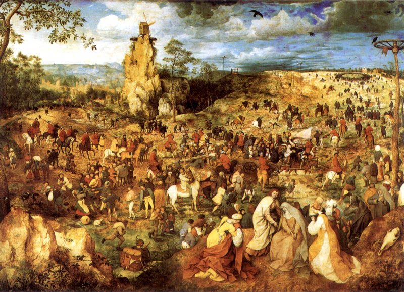 Ecco appare Bruegel “Il vecchio”, che vuole immortalare il suo tempo, mettendo nel dipinto i protagonisti della quotidianità e le estremità del suo continuum: la vita e la morte, rappresentate rispettivamente da un albero rigoglioso, e dal patibolo sul quale i condannati sono destinati alla fine. Nella mente visionaria del pittore fiammingo il progetto prende forma e le immagini ce lo propongono “vivo”, fatto di persone viventi, così che lo spettatore può essere reso partecipe. E stupito. Accanto alle centinaia di persone che affollano la tela, ai simboli di vita e morte, al mulino testimone ed elargitore di pani, sta il Cristo e la sua passione. La passione del Cristo abbandonato dagli uomini che sale verso il Calvario, per essere crocefisso insieme ai due ladroni.