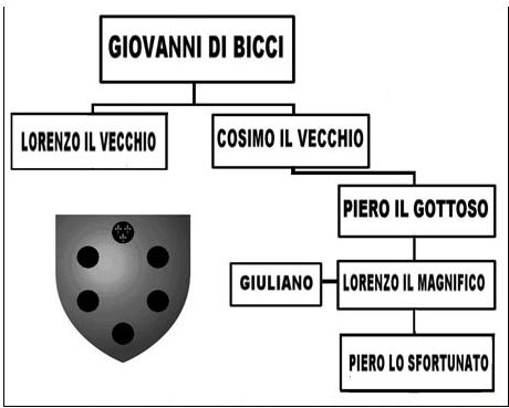 A questo punto è necessario illustrarvi le origini ed i primi passi della famiglia dei Medici, che proprio con Giovanni di Bicci (1360-1429) (figura 43) inaugura quella fase della sua storia secolare che li porterà ai massimi livelli (per la genealogia medicea, consultare la figura 44). Come potete vedere dall’immagine, nel Quattrocento è il ramo che fa capo a Cosimo il Vecchio che ci interessa; anche se il ramo cadetto (ora da tralasciare) di Lorenzo il Vecchio, fratello di Cosimo, figlio di Giovanni, saprà dare, a tempo debito, il suo importante contributo alla causa medicea.