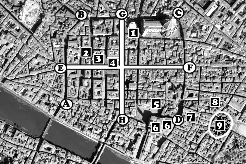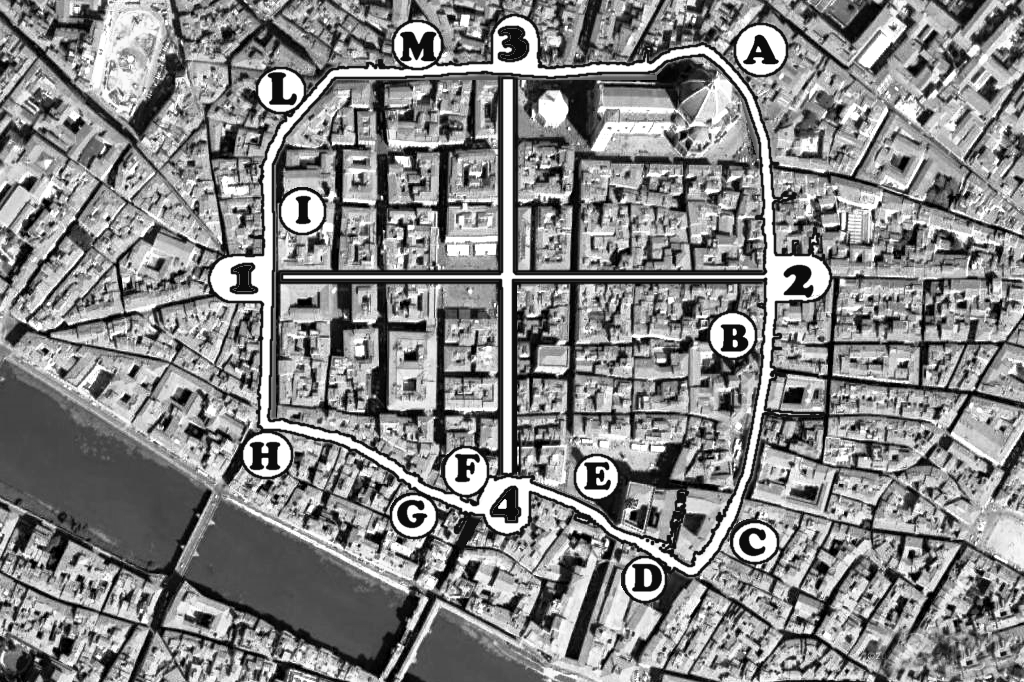 Se poi desiderate prendere coscienza fisicamente delle dimensioni del castrum, considerando l’attuale viabilità, vi propongo il seguente itinerario: Partendo da Piazza del Duomo (A), proseguite per Via del Proconsolo (B) e, dopo aver attraversato Piazza San Firenze, arrivate in Via dei Leoni (C); a questo punto abbiamo percorso il lato orientale del Cardo; qui occorre svoltare in Via della Ninna (D), attraversare Piazza della Signoria e proseguire per Via Vacchereccia (E), e scendere un poco verso l’Arno, in Via Por Santa Maria (F); si prosegue poi per Via delle Terme (G) fino a Piazza Santa Trinita (H). Siete a circa metà del percorso; saliamo poi per Via de’ Tornabuoni (I), e quindi Piazza Antinori, per piegare in Via de’ Rondinelli (L), alla fine della quale si sbocca in Via de’ Cerretani (M). Ed eccovi tornati in Piazza del Duomo. Percorrere il tour e ricollegarlo idealmente a ciò che esso storicamente rappresenta produce una certa soddisfazione intellettuale; tuttavia, nel prossimo contributo faremo insieme un tour assai più lungo e davvero ricco di testimonianze artistiche, urbanistiche e naturali (nella Figura 3: Le quattro porte ed il percorso del castrum).