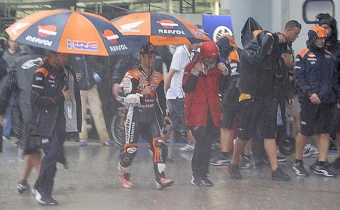 Aveva piovuto anche nelle precedenti classi, Moto2 soprattutto (vittoria di De Angelis) e Moto3 – con i festeggiamenti per il neo campione tedesco Sandro Cortese. Ma mai come in MotoGP. Guarda caso.