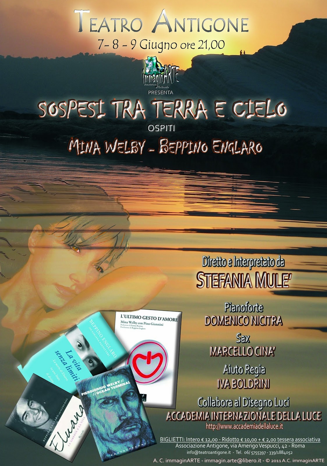 Il teatro Antigone di Roma sarà palcoscenico importante nel prossimo fine settimana, 7-8-9 giugno. L’Associazione Culturale immaginARTE organizza infatti “Sospesi Tra Terra e Cielo“, uno spettacolo teatrale scritto e interpretato da Stefania Mulè fondatrice dell’associazione, che racconta la storia di Eluana Englaro e Piero Welby, supportato anche da video immagini e da musica dal vivo. E’ la drammatica vicenda umana di due persone di cui la cronaca si è occupata a pieni giornali per le loro diverse storie cliniche, scatenando in Italia un acceso dibattito sui temi legati alle questioni di fine vita.