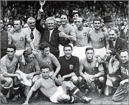 L’Italia si riscatta nel 1934 conquistando in patria il primo titolo mondiale della sua storia. Siamo in piena era fascista e Mussolini ha lavorato a fondo perchè il campionato del mondo venisse assegnato all’Italia. Vittorio Pozzo è il direttore tecnico della nazionale e guida una rosa impostata sul blocco della Juventus che sta dominando in campionato. L’esordio è semplice, 7-1 agli Stati Uniti, ma ai quarti la sfida con la Spagna ha i risvolti dell’epica. Finisce 1-1 e si va alla ripetizione, si gioca allo Stadio Comunale di Firenze e a decidere, 1-0, è una rete di Peppino Meazza al minuto 11. Un gol di Guaita regala il successo in semifinale contro la fortissima Austria di Matthias Sindelar, all’epoca il giocatore più forte al mondo, ed è finale con la Cecoslovacchia. Al 76′ si mette male, Puc porta in vantaggio gli avversari; la reazione è immediata, quattro minuti e l’oriundo argentino Raimondo Orsi, detto “Mumo“, pareggia prima del gol-vittoria di Schiavio nel primo tempo supplementare che infila il leggendario portiere Planicka. Al cospetto del Duce gli azzurri alzano la Coppa Jules Rimet.