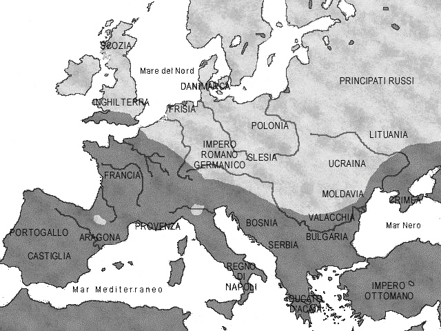 Il terzo motivo di crisi – forse il più grave – fu la durissima ondata di pestilenza, pare proveniente dalla Cina, che nel 1347 arrivò in Europa tramite le rotte commerciali. La pandemia si diffuse nelle zone portuali, a Messina e nelle città sul Tirreno, per poi spargersi ovunque, assumendo contorni allucinanti: le città assistevano impotenti al progredire del contagio, terrorizzate di scoprire da un giorno all’altro i segni della comparsa del male (bubboni nella zona ascellare e inguinale, macchie nere, fino all’espettorazione di sangue). L’epidemia fu particolarmente violenta per la debolezza endemica di larghe fette di popolazione denutrite, con il sistema immunitario depresso e per le precarie condizioni igieniche di molti centri urbani sovraffollati. L’epidemia della peste nera del 1348 colpì tutta l’Europa, dando il colpo di grazia a un’economia che stava già subendo un generale ristagno. Si calcola, ma le stime variano molto, che Firenze perdette 50.000 o addirittura 65.000 unità su 100.000. In ogni caso i primi dati storicamente accertabili si hanno nel 1427 con le stime catastali che calcolano una popolazione risalita a circa 70.000 unità. Va considerato che molti erano anche scappati dalla città per la paura del contagio, come testimonia nel suo eccezionale resoconto della peste Giovanni Boccaccio, che proprio nel Decameron ritrasse quella società cortese ed aurea sull’orlo della scomparsa; la peste causò la morte, tra gli altri, del grande cronista Giovanni Villani e della Laura, amata e celebrata nei versi di Francesco Petrarca. In figura 33 la diffusione (grigio scuro) della Peste nera del 1348.