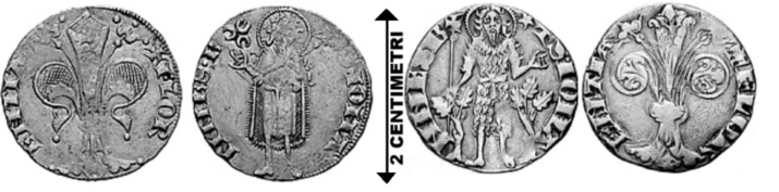 Il commercio, le attività bancarie e quelle manifatturiere si sostenevano a vicenda, generando un circolo virtuoso che macinava straordinarie ricchezze, che però non toccavano la gran parte dei malpagati ceti subalterni della città e del contado. Interprete principale di tutto ciò: il fiorino (figura 31), moneta coniata in oro fin dal 1252 ed usata nel mercato internazionale, mentre il fiorino d’argento, coniato dal 1296, era destinato agli affari interni e di minor conto; il nome derivava dal giglio (in latino flos, simbolo araldico di Firenze) rappresentato su un lato della moneta, laddove sull’altro si trovava San Giovanni Battista […]. Perché abbiate un ordine di grandezza, si può dire che oggi un fiorino, grande all’incirca come una moneta da un euro, sarebbe pari, all’incirca, a 110 euro; quindi 10 fiorini a 1.100 euro e 1.000 fiorini a 110.000 euro; costruire un palazzo costava all’incirca 2.000 fiorini pari quindi a 220.000 euro, cioè 400.000.000 circa di vecchie lire.