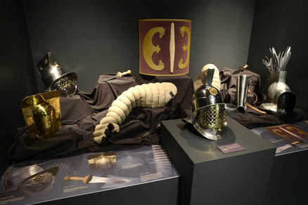 Premessa della prima sezione de “Un giorno al Colosseo” una sezione introduttiva sull’estensione dell’Impero romano. E subito ci si inoltra nella mostra con il tema dell’anfiteatro. Luogo per antonomasia d’intrattenimento di massa e testimonianza delle grandi capacità architettoniche e ingegneristiche dei Romani, il Colosseo era animato sugli spalti oltre ogni dire e nell’arena dalla presenza di bestie e gladiatori. Questi ultimi rappresentano in toto il tema principale della seconda sezione de “Un giorno al Colosseo”. Di essi viene illustrata l’esistenza quotidiana, l‘identità, la provenienza, gli allenamenti, i tipi di combattenti e le varie tecniche di combattimento.